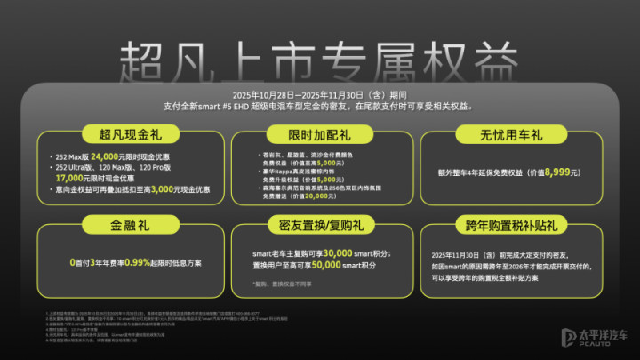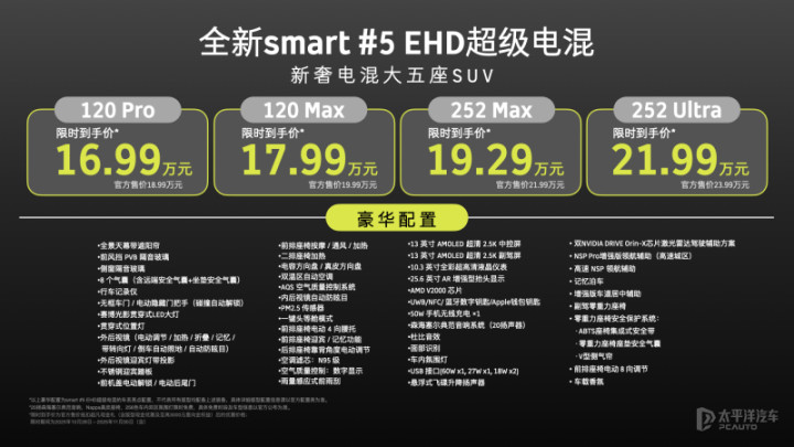 全新smart精灵#5EHD限时售价车型售价(万元)120Pro16.99120Max17.99252Max19.29252Ultra21.99