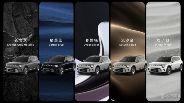 2.内外配色:提供苍岩灰、星漩蓝、流沙金、粒子白、赛博银共5种外观颜色可选;提供浅蜜棕和曜石黑2种内饰颜色可选;